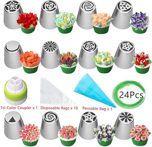 Amazon Com Russian Piping Tips Set Wowdecor 24pcs Supplies Kit Icing Nozzles Flowers Shaped Frosting Bags And Tips Baking Supplies Kitchen Dining Nozzle And Injector Difference