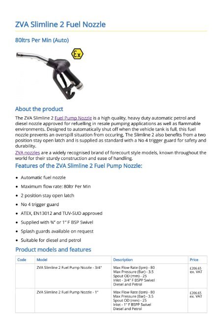 Zva nozzles as seen on the forecourt are high end fuel nozzles approved for resale dispensing rather than just private applications. Simple repairs can be done on site by service company personnell. The dispenser area stays cleaner.